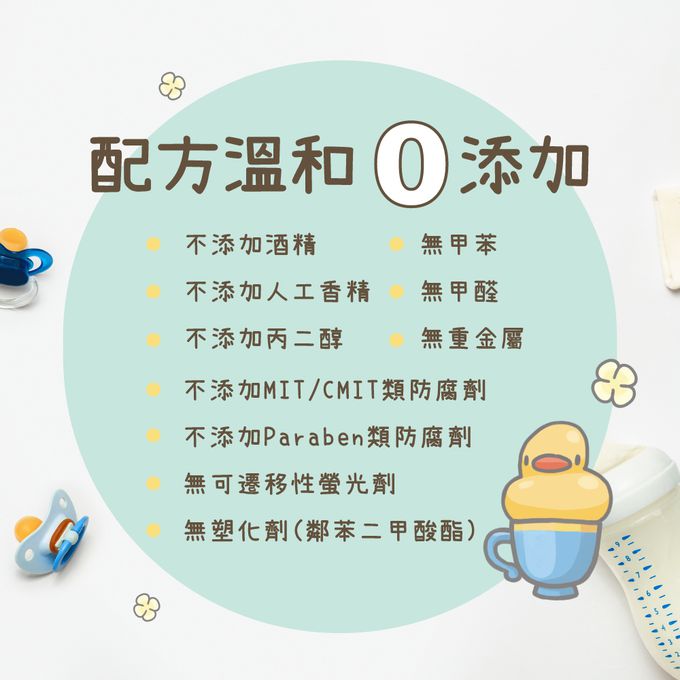 溫和配方,不含甲醛、酒精、香料、螢光劑