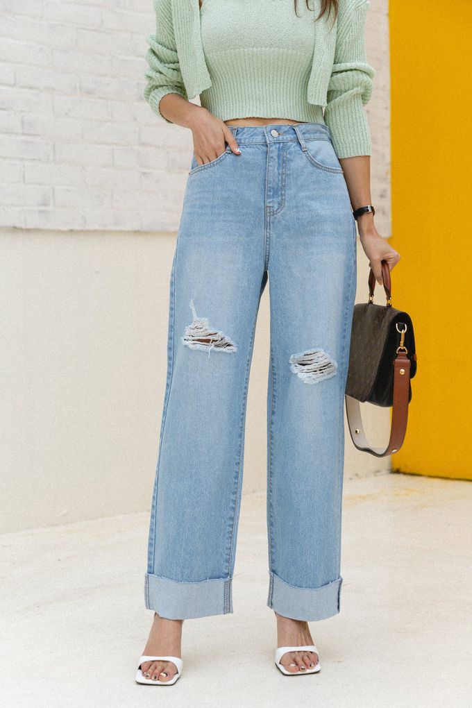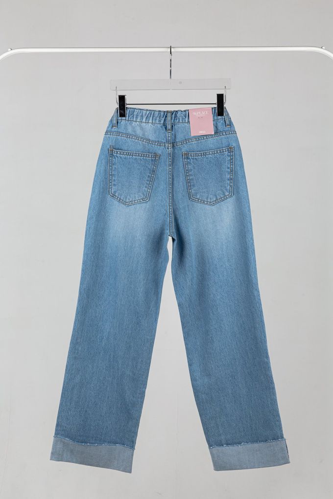 韓國女裝連線 - 96PLACE 後鬆緊腰刷破感反折直筒寬褲-淺藍