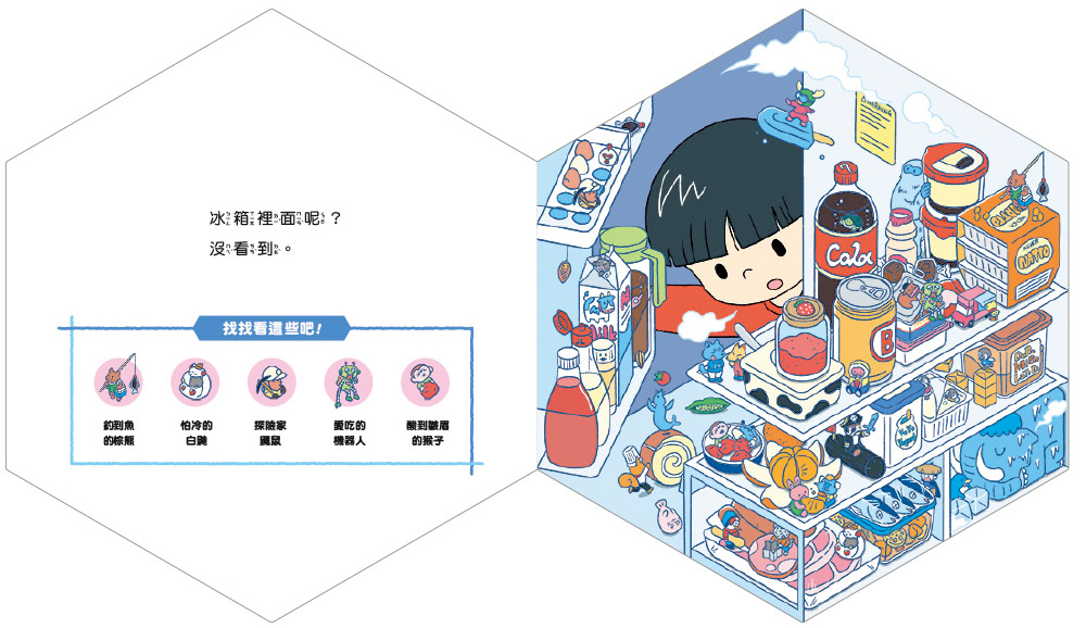 看到書名《倉鼠到哪去了?》,就能猜到這是一本找找書。果然,第一頁開門見山,直接告訴讀者要找的是倉鼠。小男孩在許多空間中尋找倉鼠,而每個空間還附帶其他提示,讓讀者順便找其他東西,增添挑戰性。不過,書中文字不多,圖畫也不像《威利在哪裡?》那樣複雜,似乎很容易就能完成。我翻譯完後,第一個想法是:這可能是為年齡層較低的小朋友設計的。而且書的形狀做成了六角形,令人耳目一新。