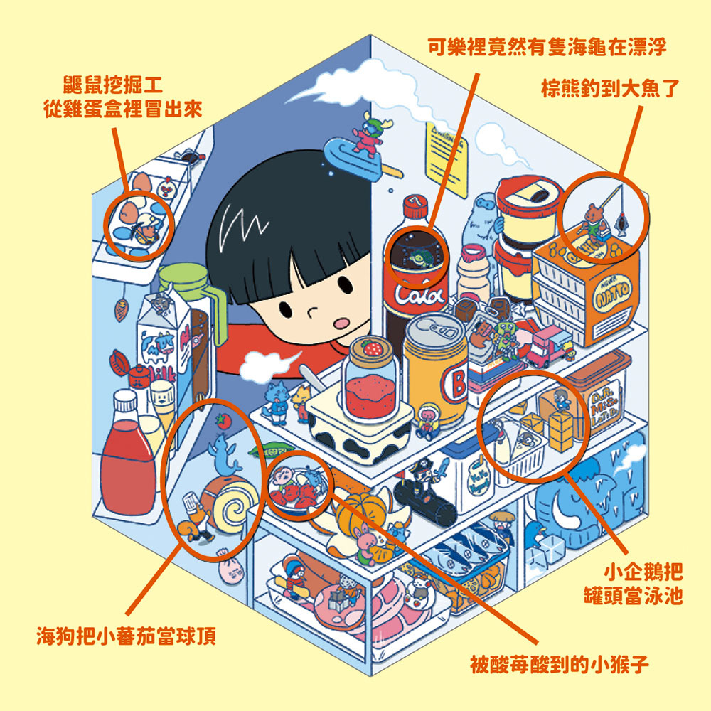 小男孩的玩具喜歡四處串門子, 原本待在玩具箱的白熊酷超人,後來躺在醫藥箱裡,發生什麼事了? 海盜桶上面的海盜跑到哪裡去了?怕熱的胖企鵝又躲到哪去了呢?