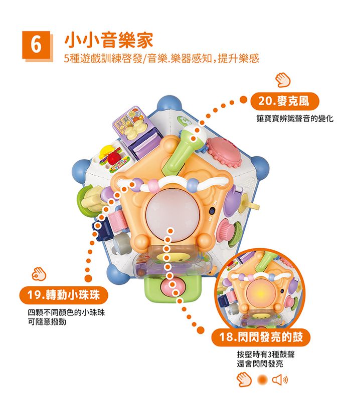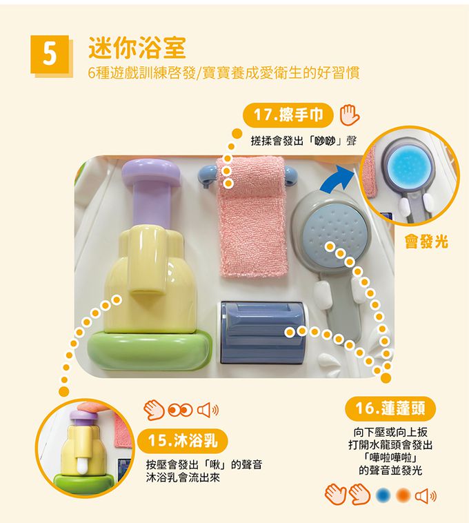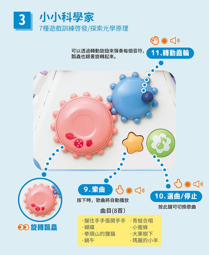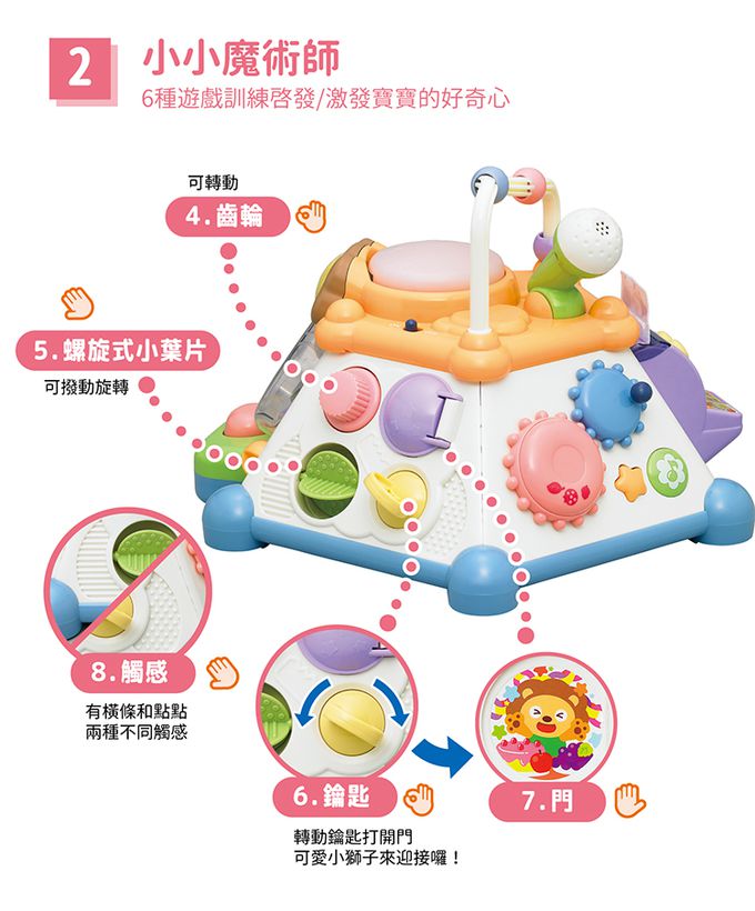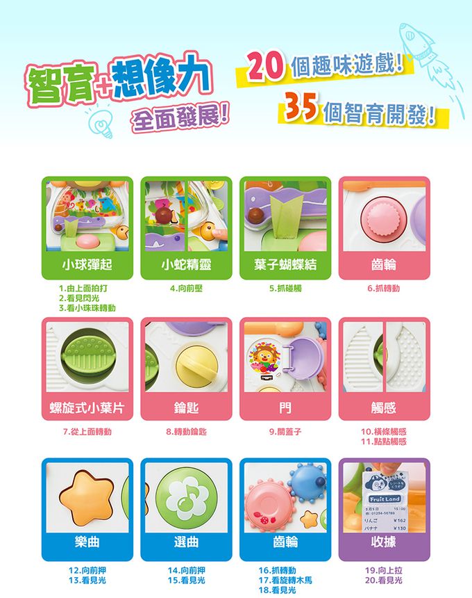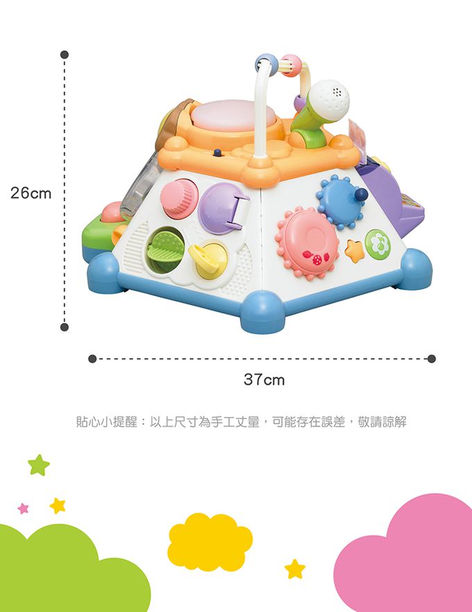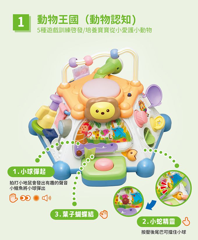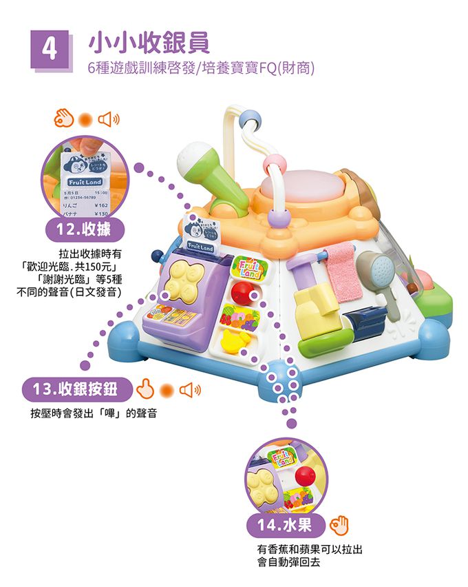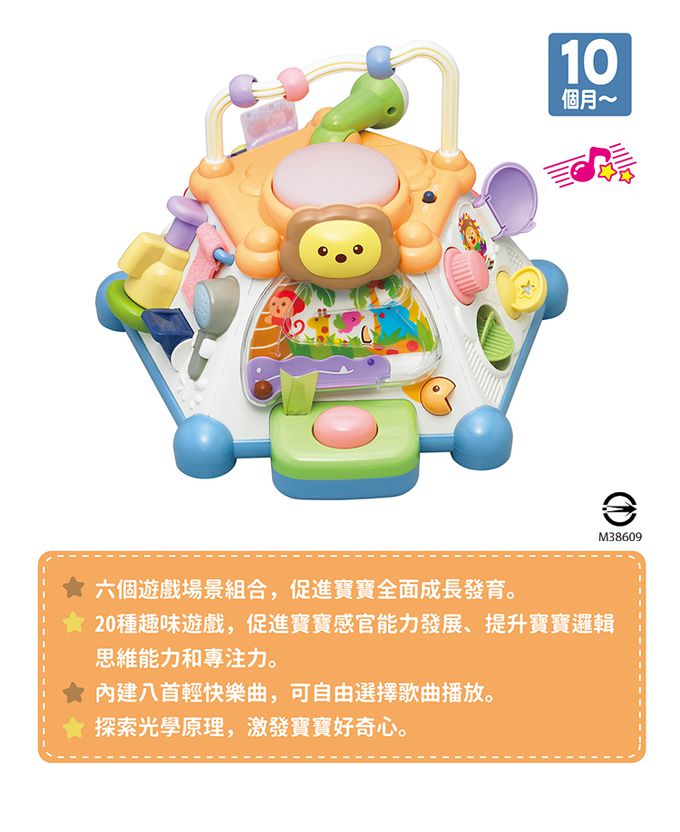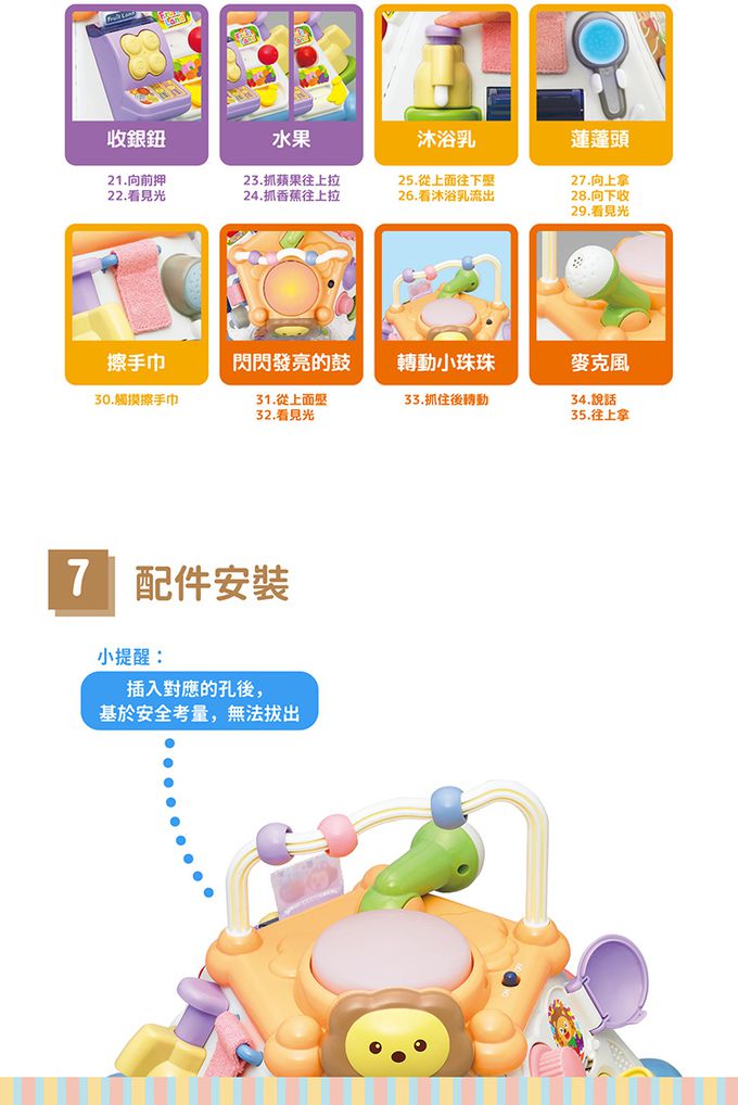 注意事項:適用年齡:10個月以上(不適用10個月以下) 主要材質:ABS 產地:中國 商品檢驗標識號:M38609 【注意事項】 ● 須由成年人拆開包裝後使用,並於拆卸後立即將塑膠袋銷毀、丟棄。 ● 勿用酒精及熱水清潔消毒,避免塑膠溶化變質,請用溫水擦拭清潔。 ● 玩具如有電子零件或發音器零件,勿於水龍頭底下沖洗或直接泡入水中,以免零件損壞及生鏽。 ● 詳細產品清潔方式及使用說明,請參看官方網站 www.toyroyal.com.tw。 ● 上方提桿設有卡鎖,裝上後即固定住,以確保產品安全性。 ● 玩具如有破損或斷裂,勿再讓孩童玩耍,以免割傷。 ● 内如附有線、繩、綁帶等玩具,為防止可能纏結孩童頸部造成窒息傷害,請在成年人監護下玩耍。 ● 玩具如有破損或斷裂,請勿再讓孩童玩耍,以免割傷。 ● 此玩具需要安裝電池,如長期不使用時,請記得將電池拔出,以免電池漏液損壞玩具。