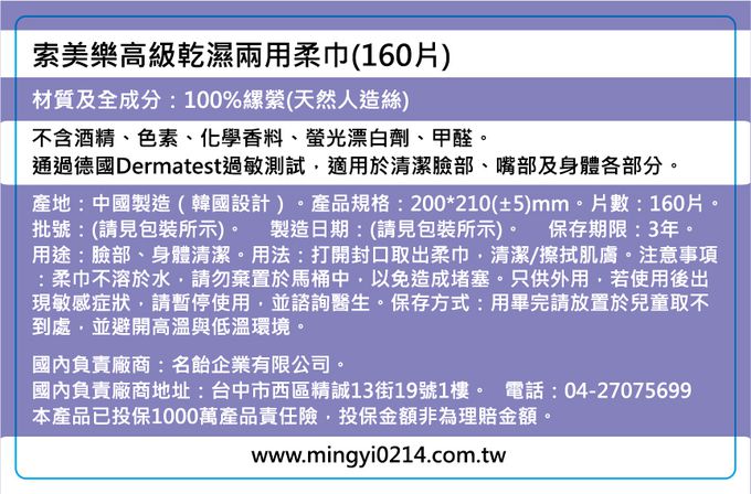 注意事項:注意事項:柔巾不溶於水,請勿棄置於馬桶中,以免造成堵塞。只供外用,若使用後出現敏感症狀,請暫停使用,並諮詢醫生。保存方式:用畢完請放置於兒童取不到處,並避開高溫與低溫環境。