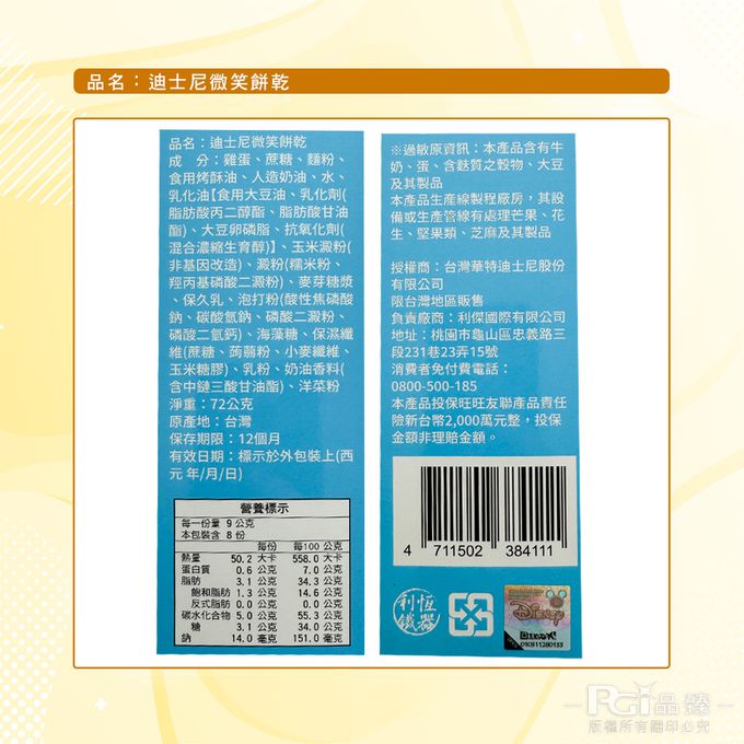 過敏原:本產品含有牛奶、蛋、含麩質之穀物、大豆及其製品。本產品生產線製程廠房,其設備或生產管線有處理芒果、花生、堅果類、芝麻及其製品。