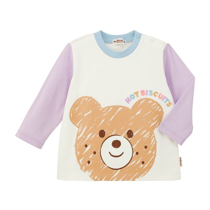 以蠟筆筆觸描繪的小熊beans大臉圖案為特色的長袖T恤。