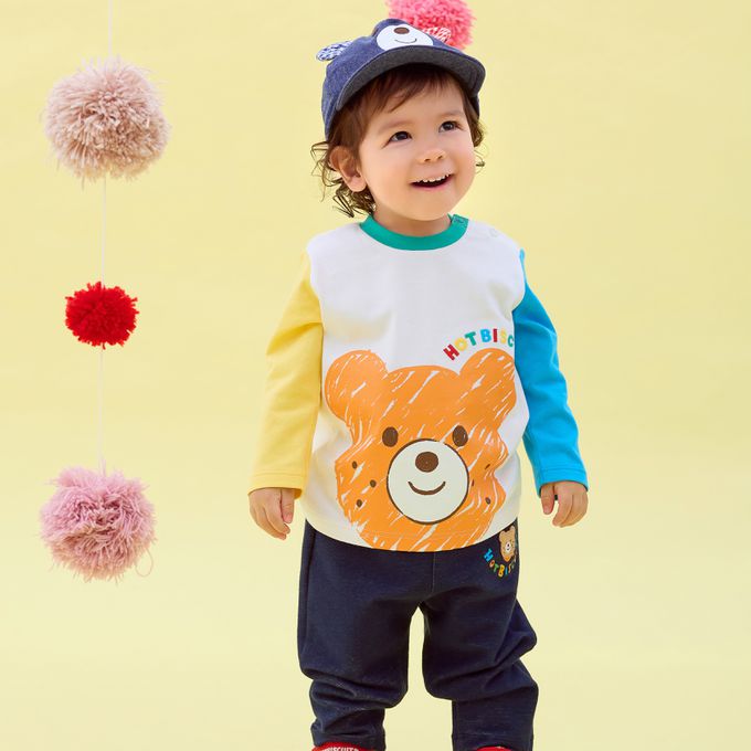 以蠟筆筆觸描繪的小熊beans大臉圖案為特色的長袖T恤。