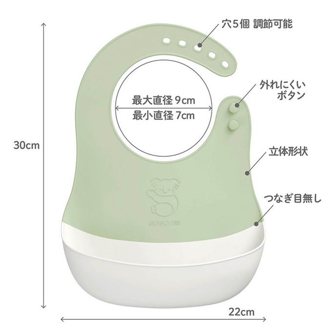 注意事項:●使用前請先閱讀本說明書,並依照記載內容正確地使用。●錯誤的操作可能會造成人體的傷害或損壞物品。●請勿作為其他用途使用。●初次使用前,請務必確認是否有刮痕、破損、裂痕、變形、毛邊等異常。●請勿使用已受損或變形的產品。●若誤吞碎片時,請立即就醫。●本產品的穿脫請務必由家長或大人協助操作。穿戴時請確認頸部是否過於緊繃,並確實調整到適當的大小,以免造成窒息的危險。●使用中若幼童感到不適,請立即從脖子上取下。●初次使用前時請務必先清洗乾淨,並置於通風處晾乾。●使用後務必清洗乾淨。清洗時請使用柔軟的海綿和餐具洗潔精,避免使用去污粉或棕刷等。●因材質本身的特性,可能會有特殊的氣味,可置於通風良好處陰乾1~2天。●清洗後請充分晾乾,並保管於幼童無法取得的地方。否則可能造成發霉。●深色食物或調味料(如番茄、南瓜、紅蘿蔔、咖哩等)可能會沾染上顏色或殘留味道,敬請知悉。●口袋可能會垂掛於桌緣,若幼童覺得吃飯較為困難時,請調整椅子或桌子高度。●請勿放置在火源旁或會產生高溫的地方。●請勿讓幼童揮舞或投擲玩耍,否則可能造成臉部或身體受傷。●請勿長時間扭曲折疊保存,以免造成產品劣化或變形。●強行拉扯可能會造成斷裂。●請勿靠近刀具或尖銳物品。●使用中或使用後若肌膚出現異常(發紅、腫脹、搔癢等),請立即就醫。●若幼童為的肌膚較為敏感,請在圍兜領口處與肌膚之間墊一塊軟布再使用。【耐熱溫度:120℃】