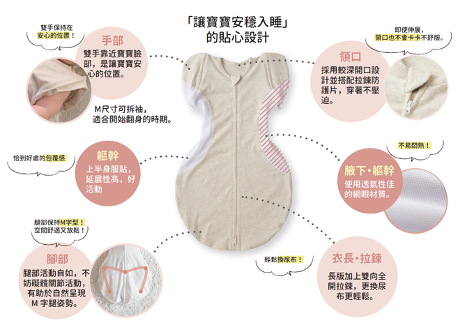 防抓傷設計 柔軟材質呵護寶寶肌膚,避免睡夢中抓傷自己。