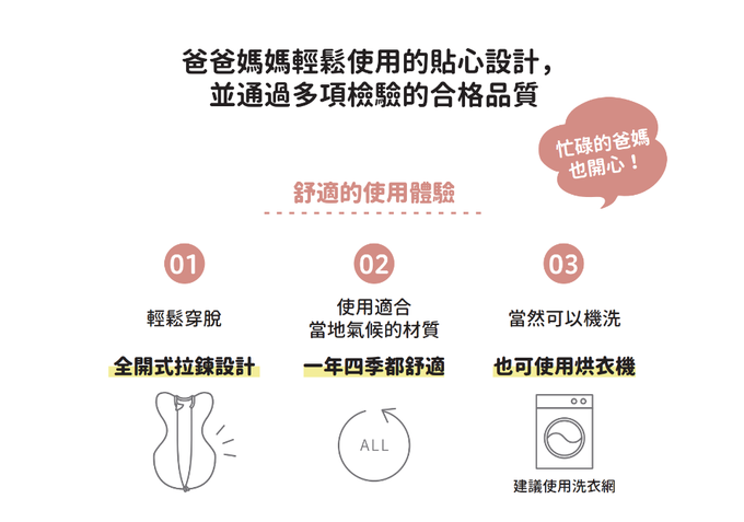 ●推薦亮點・透氣的網眼材質,夏天也適用・可機洗、可烘乾,清洗簡單・長版加上雙向全開拉鍊,更換尿布更輕鬆・立體設計貼合身形,貼合上半身不緊繃