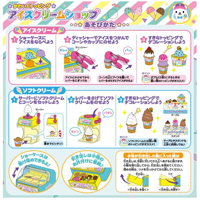 使用方式:●本產品為玩具,請勿作為實際用途使用。※圖片或插圖與實際商品可能略有差異。<冰淇淋的玩法>①將冰淇淋排放在展示櫃中。②用挖冰杓挖取冰淇淋,放在甜筒或杯子上。③再加上喜歡的配料就完成了。<霜淇淋的玩法>①將霜淇淋和甜筒放入冰淇淋機中。②拉下拉桿,將霜淇淋擠在甜筒上。③再加上喜歡的配料就完成了。