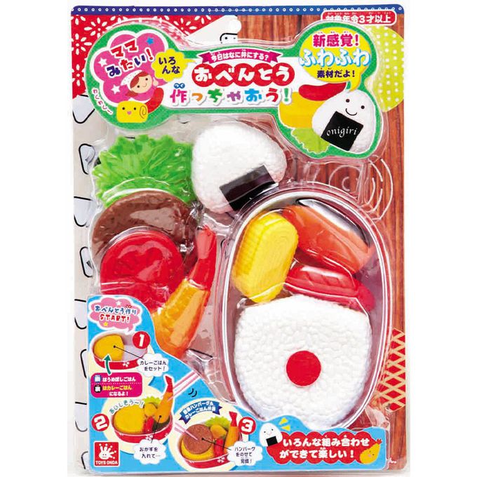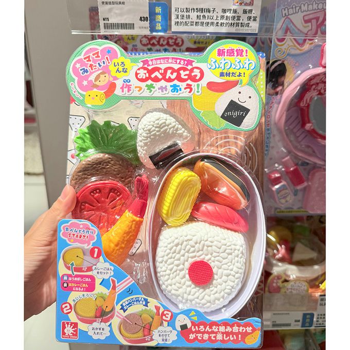 材質:【飯糰】熱塑性橡膠(TPR)、聚丙烯(PP)【白飯、炸蝦、鮭魚、小香腸、玉子燒、漢堡排】熱塑性橡膠(TPR)【番茄、生菜、便當盒】聚氯乙烯(PVC)【隔板】紙