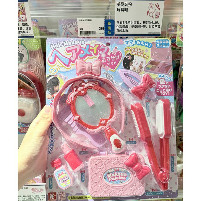 注意事項:●本產品為玩具,無法用於實際化妝。●使用化妝刷時,請注意避免接觸到眼睛。●使用唇膏時,請注意避免放入口中。●玩完後,請保管於3歲以下幼童無法取得的地方。●請勿將手指伸入商品的可動部位,以免夾傷。●請勿用力撞擊或揮舞本產品,以免造成損壞或受傷。●請勿使用已受損或變形的產品。●包材請在開封後立即丟棄。以免造成誤食、窒息等意外事故。●適用年齡:不適合未滿3歲的幼童。●本產品有細小零件。因有可能會發生誤食、窒息的危險,因此請勿讓未滿3歲的幼童玩。●請務必於家長或大人監護下使用本產品。
