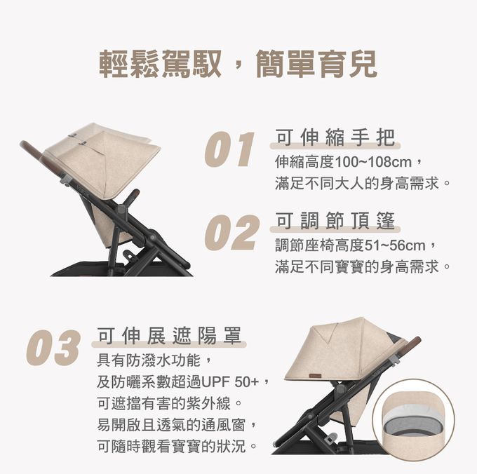 可遮擋有害的紫外線。易開啟且透氣的通風窗,可隨時觀看寶寶的狀況●手把和防撞桿以REACH認證的真皮皮革包覆●GREENGUARD金牌認證,給予清新與健康的環境