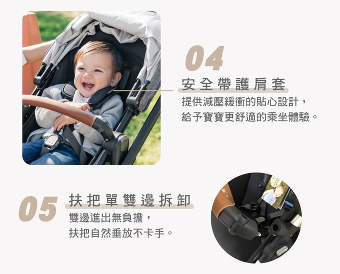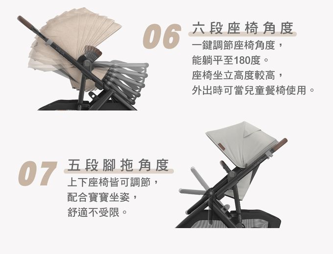 ●腳踏墊可調節高度,配合寶寶坐姿,舒適不受限●椅子後背採用透氣式網布設計,同時配有可拆卸椅墊,能對應不同溫度及氣候更換●五點式磁吸式安全扣,一鍵調節安全帶,輕鬆方便操作●座椅皆可調整前後兩個方向,能躺平至180度●可伸展的遮陽罩,具有防潑水功能,及防曬系數超過UPF 50+,