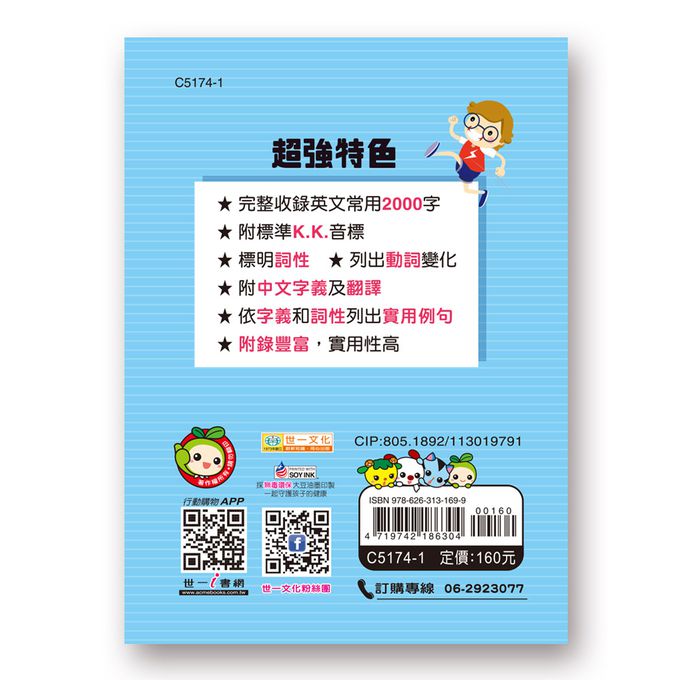 本書依教育部公布之常用2000詞編輯而成,每一單字皆附K.K音標,詞性,中文單字解釋,實用例句及動詞變化,便於攜帶,背誦.是學習英文的最佳隨身利器.