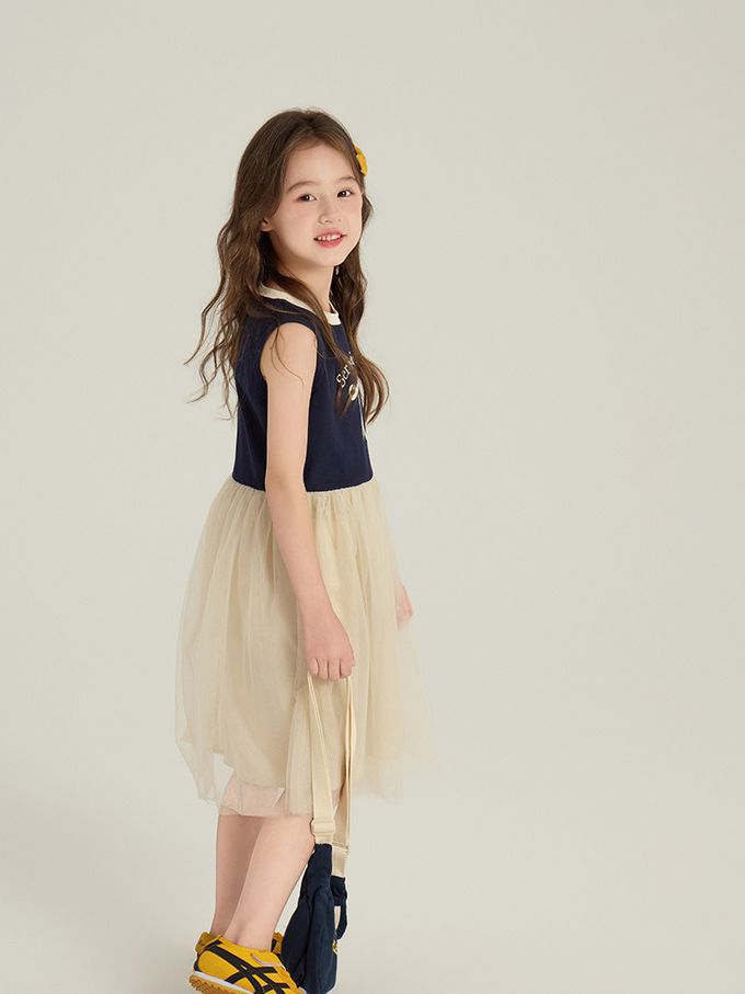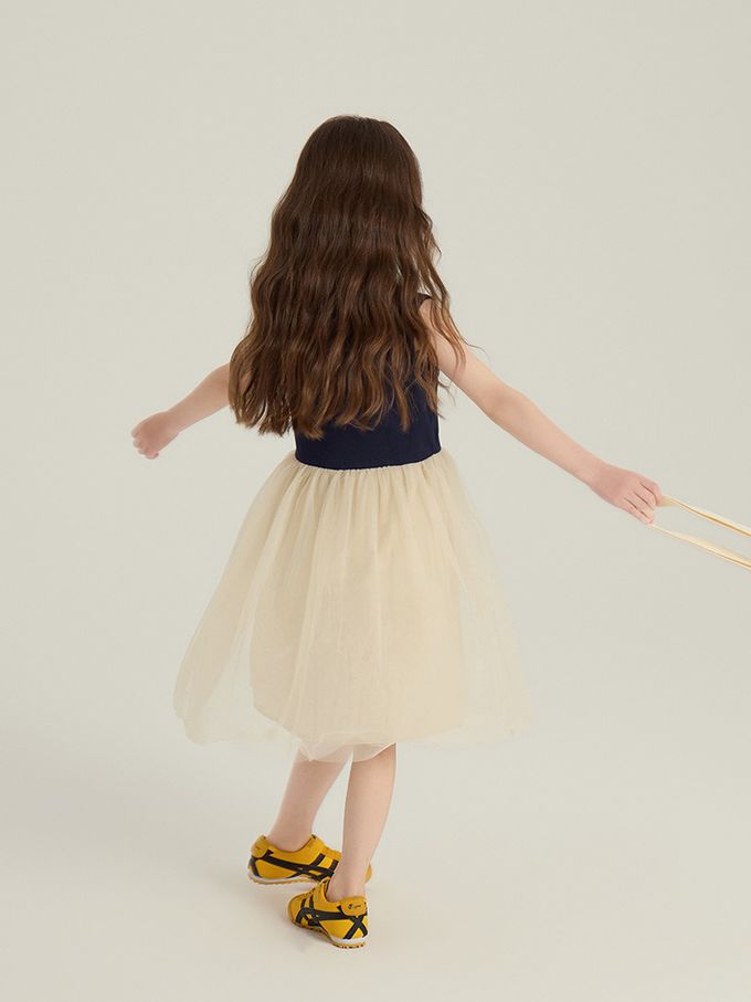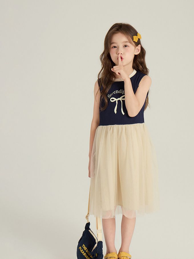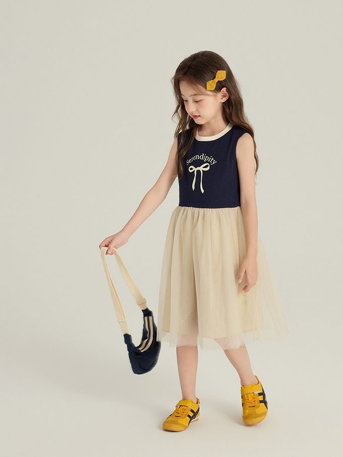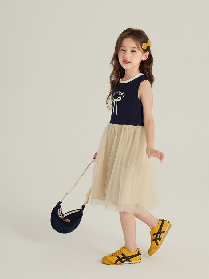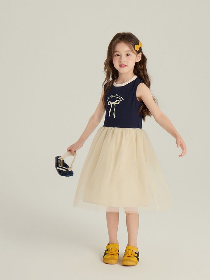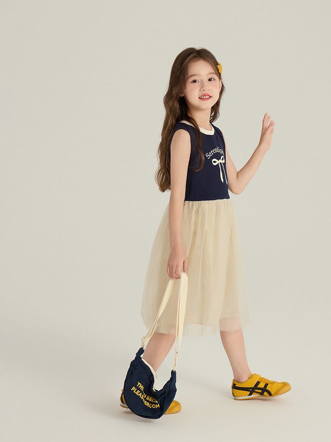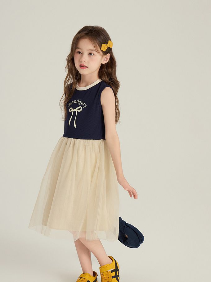 針織蝴蝶結拼接網紗無袖洋裝-藏青x杏