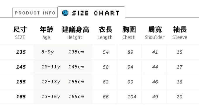 1. 尺寸表單位皆為公分(cm),實際尺寸會因布料彈性、水洗、測量起迄點等因素略有誤差。建議參考孩子平時穿著衣物尺寸進行選購。