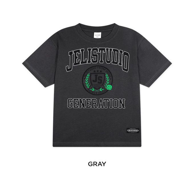 韓國 JELISTUDIO - 學院文字圖案純棉短袖上衣-深灰