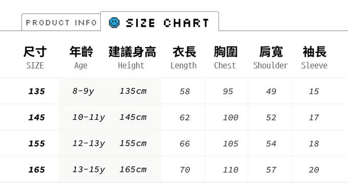 1. 尺寸表單位皆為公分(cm),實際尺寸會因布料彈性、水洗、測量起迄點等因素略有誤差。建議參考孩子平時穿著衣物尺寸進行選購。