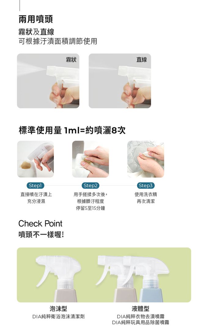 ● 內容物:DIA 純粹洗衣精1000ml *2+DIA 純粹衣物去漬噴霧500ml *1
