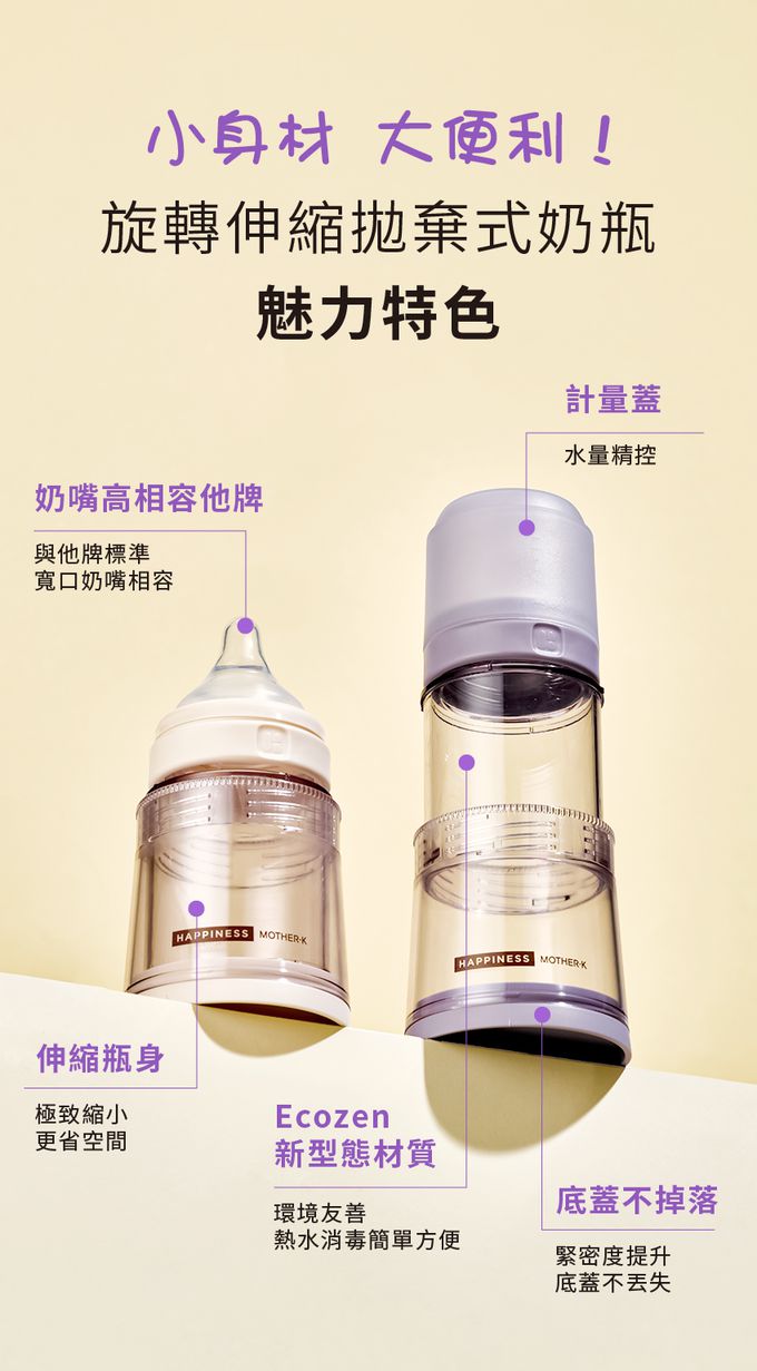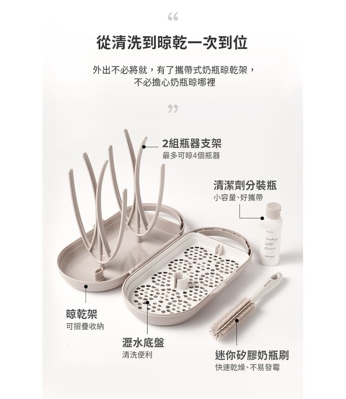 ● 內容物:精粹Ecozen伸縮拋棄式奶瓶-清澄紫*1+溫感雙鎖拋棄式奶瓶袋 50入(雙夾鏈)*1+精粹極簡奶嘴環2入-清澄紫*1+積木式奶嘴收納盒*1+攜帶式奶瓶晾乾架-榛果奶茶*1
