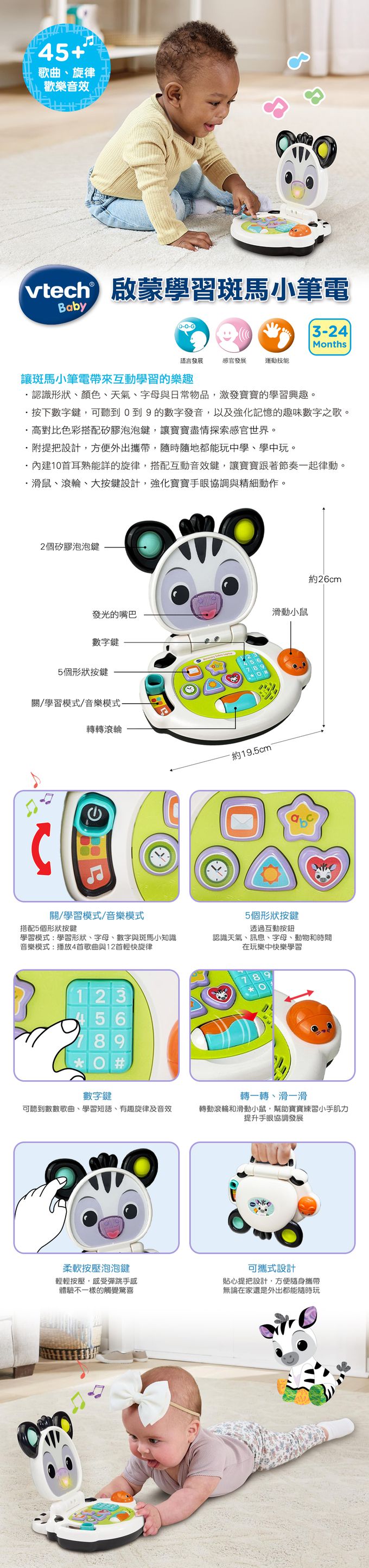 ‧內建10首耳熟能詳的旋律,搭配互動音效鍵,讓寶寶跟著節奏一起律動。