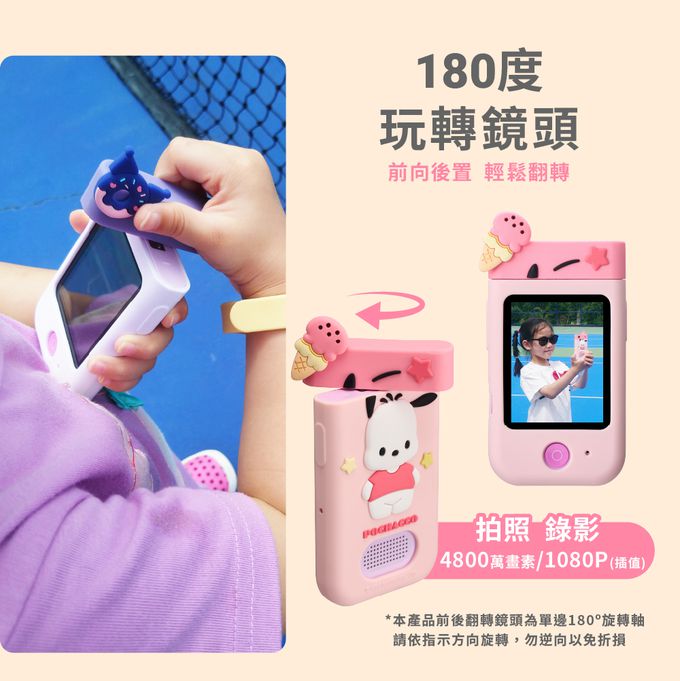 單鏡頭翻轉設計讓寶貝能隨意切換前後鏡頭,而且連閃光燈都有,真的有模有樣❤️