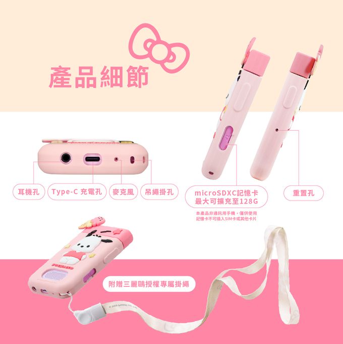 底部設有:耳機孔/Type-c充電孔/麥克風/吊繩掛孔;側邊設有:記憶卡插孔/重置孔,還有附贈三麗鷗授權專屬掛繩呦😍