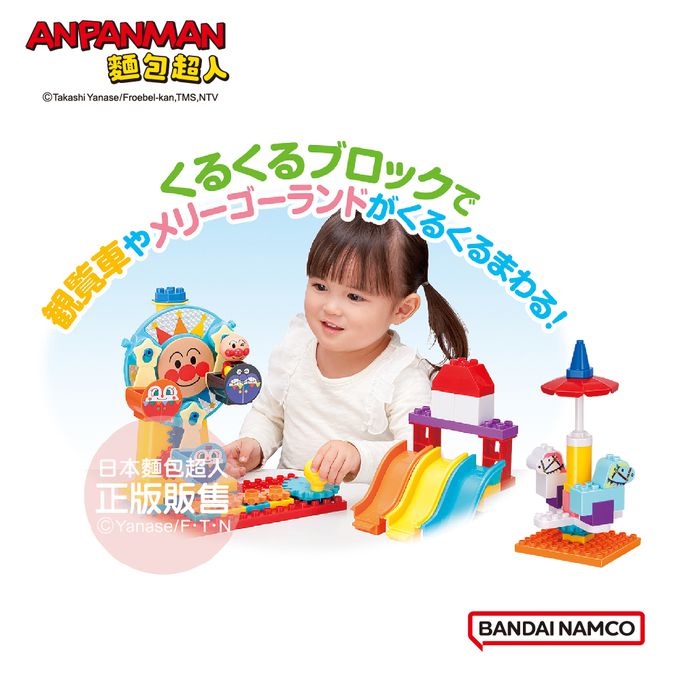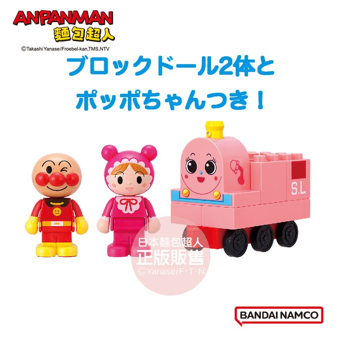 組合內容:共73個積木及配件(內含麵包超人人偶*1、紅精靈人偶*1、火車寶寶*1)、背景*1、玩法指引(日語)*1