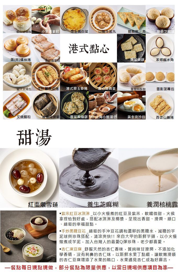 ■主廚美饌(選2) ■港式點心(選4) ■開胃小菜1份 ■養心茗茶/飲品2人份