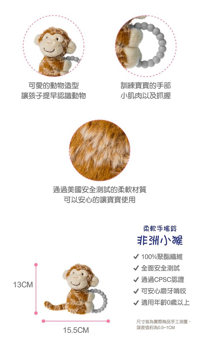 ●商品聲響設計,能刺激寶寶聽覺發展,同時促進手指靈活度練習