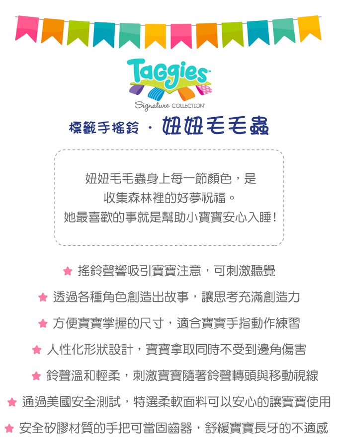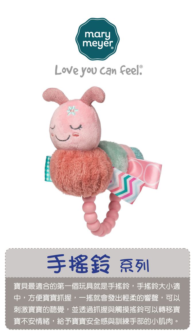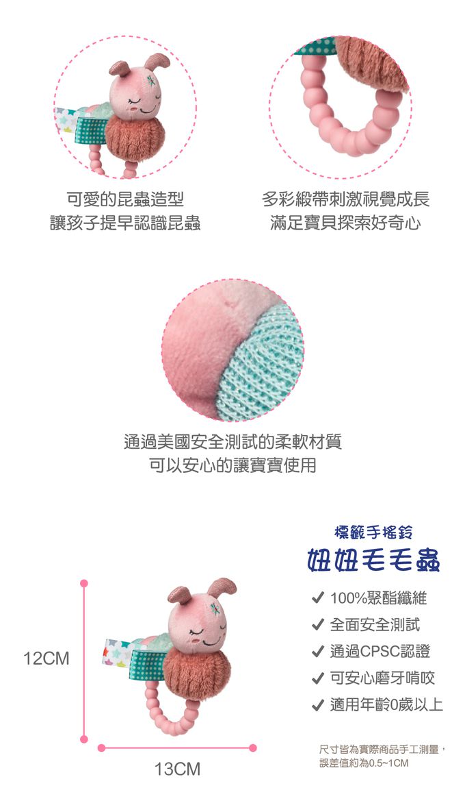 ●妞妞毛毛蟲身上每一節顏色,是收集森林裡的好夢祝福。她最喜歡做的事就是幫助小寶寶安心入睡●矽膠材質的手把可當固齒器,有效滿足寶寶口慾期需求,並舒緩口腔不適●適合小手的尺寸易抓握,讓寶寶輕鬆訓練小手的肌肉●頭頂上有可愛的觸角和不同顏色的身體,帶來豐富的觸感刺激●商品聲響設計,能刺激寶寶聽覺發展,同時促進手指靈活度練習