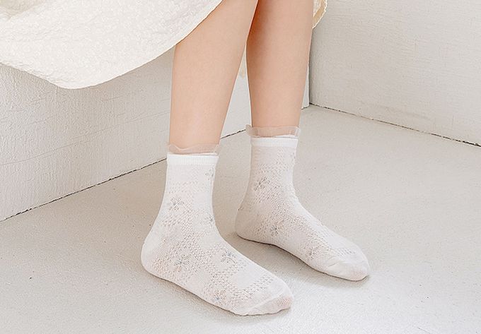 蔚藍蝴蝶結荷葉邊透氣短筒棉襪-5 雙一組