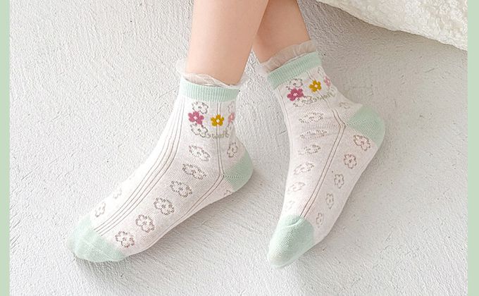 盛夏花園清新花朵甜美荷葉邊透氣短筒棉襪-5 雙一組