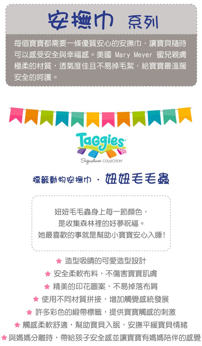●妞妞毛毛蟲身上每一節顏色,是收集森林裡的好夢祝福。她最喜歡做的事就是幫助小寶寶安心入睡●柔軟的觸感帶來滿滿安全感,幫助寶寶勇敢學會自行入睡●許多彩色的緞帶標籤,提供觸感的刺激●繽紛的色彩搭配精緻刺繡細節,有助於促進寶寶視覺發展●安全柔軟布料,不傷害寶寶柔嫩肌膚