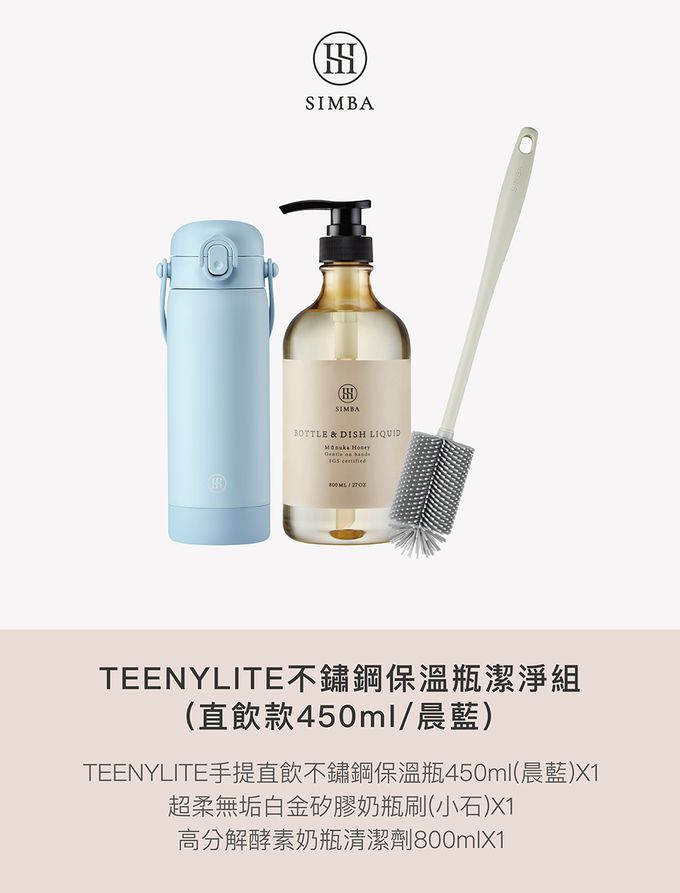 內容物:TEENYLITE手提直飲不鏽鋼保溫瓶450mlX1+超柔無垢白金矽膠奶瓶刷X1+高分解酵素奶瓶清潔劑800mlX1