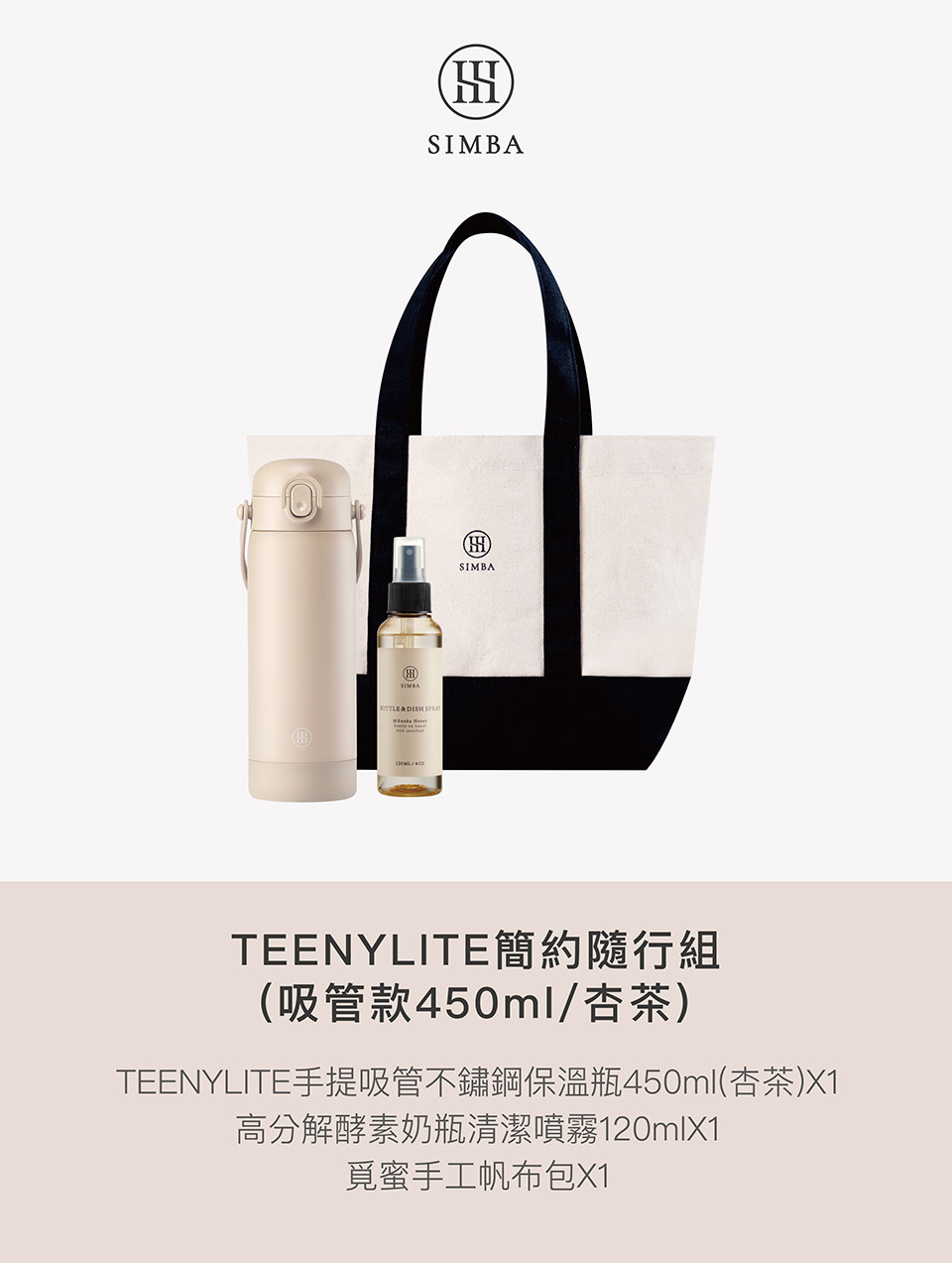 內容物:TEENYLITE手提吸管不鏽鋼保溫瓶450mlX1+高分解酵素奶瓶清潔噴霧120mlX1+覓蜜手工帆布包X1