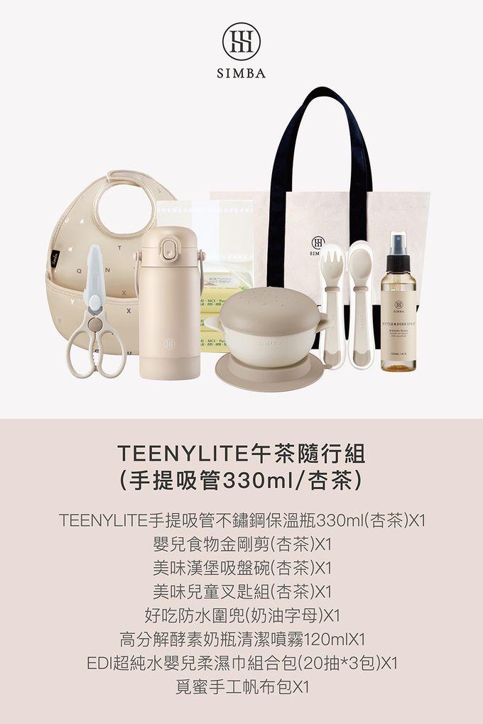 內容物:TEENYLITE手提吸管不鏽鋼保溫瓶330mlX1+嬰兒食物金剛剪X1+美味漢堡吸盤碗X1+美味兒童叉匙組X1+好吃防水圍兜X1+高分解酵素奶瓶清潔噴霧120mlX1+EDI超純水嬰兒柔濕巾組合包(20抽*3包)X1+覓蜜手工帆布包X1
