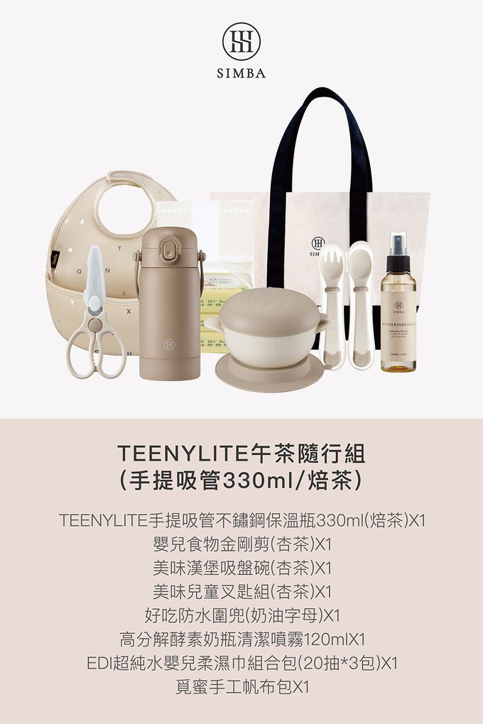 內容物:TEENYLITE手提吸管不鏽鋼保溫瓶330mlX1+嬰兒食物金剛剪X1+美味漢堡吸盤碗X1+美味兒童叉匙組X1+好吃防水圍兜X1+高分解酵素奶瓶清潔噴霧120mlX1+EDI超純水嬰兒柔濕巾組合包(20抽*3包)X1+覓蜜手工帆布包X1
