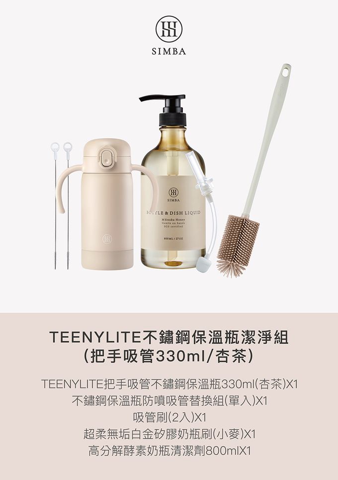 內容物:TEENYLITE把手吸管不鏽鋼保溫瓶330mlX1+不鏽鋼保溫瓶防噴吸管替換組(單入)X1+吸管刷(2入)X1+超柔無垢白金矽膠奶瓶刷X1+高分解酵素奶瓶清潔劑800mlX1