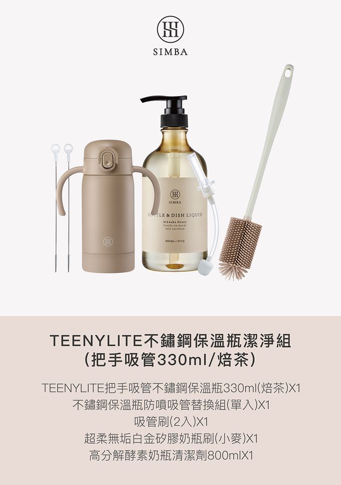 內容物:TEENYLITE把手吸管不鏽鋼保溫瓶330mlX1+不鏽鋼保溫瓶防噴吸管替換組(單入)X1+吸管刷(2入)X1+超柔無垢白金矽膠奶瓶刷X1+高分解酵素奶瓶清潔劑800mlX1