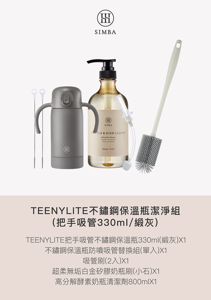 內容物:TEENYLITE把手吸管不鏽鋼保溫瓶330mlX1+不鏽鋼保溫瓶防噴吸管替換組(單入)X1+吸管刷(2入)X1+超柔無垢白金矽膠奶瓶刷X1+高分解酵素奶瓶清潔劑800mlX1