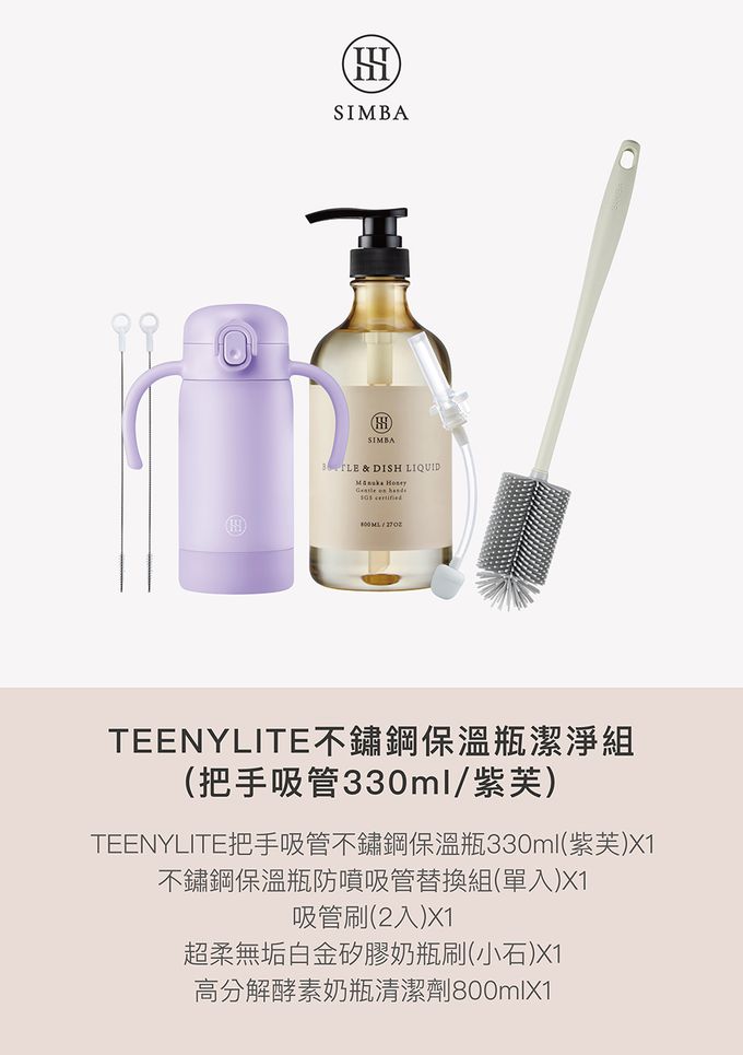 Simba 小獅王辛巴 - TEENYLITE不鏽鋼保溫瓶潔淨組-紫芙-把手吸管330ml