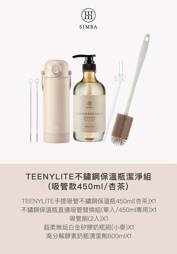 內容物:TEENYLITE手提吸管不鏽鋼保溫瓶450mlX1+不鏽鋼保溫瓶直通吸管替換組(單入/450ml專用)X1+吸管刷(2入)X1+超柔無垢白金矽膠奶瓶刷X1+高分解酵素奶瓶清潔劑800mlX1