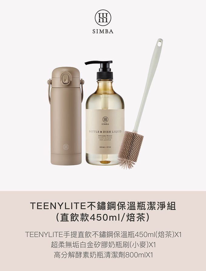 內容物:TEENYLITE手提直飲不鏽鋼保溫瓶450mlX1+超柔無垢白金矽膠奶瓶刷X1+高分解酵素奶瓶清潔劑800mlX1