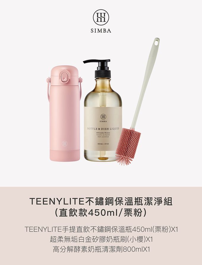 內容物:TEENYLITE手提直飲不鏽鋼保溫瓶450mlX1+超柔無垢白金矽膠奶瓶刷X1+高分解酵素奶瓶清潔劑800mlX1