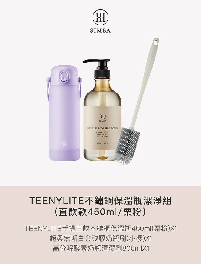 內容物:TEENYLITE手提直飲不鏽鋼保溫瓶450mlX1+超柔無垢白金矽膠奶瓶刷X1+高分解酵素奶瓶清潔劑800mlX1