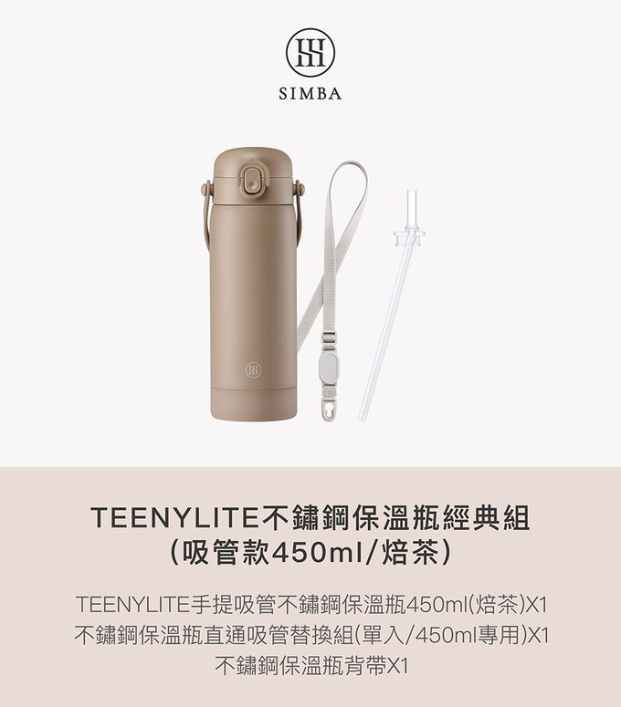 內容物:TEENYLITE手提吸管不鏽鋼保溫瓶450mlX1+不鏽鋼保溫瓶直通吸管替換組(單入/450ml專用)X1+不鏽鋼保溫瓶背帶X1