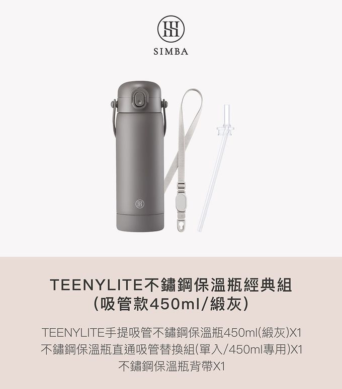 Simba 小獅王辛巴 - TEENYLITE不鏽鋼保溫瓶經典組-緞灰-吸管款450ml