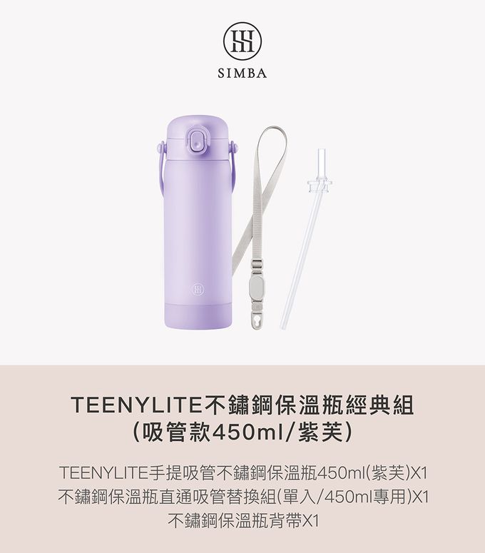 內容物:TEENYLITE手提吸管不鏽鋼保溫瓶450mlX1+不鏽鋼保溫瓶直通吸管替換組(單入/450ml專用)X1+不鏽鋼保溫瓶背帶X1