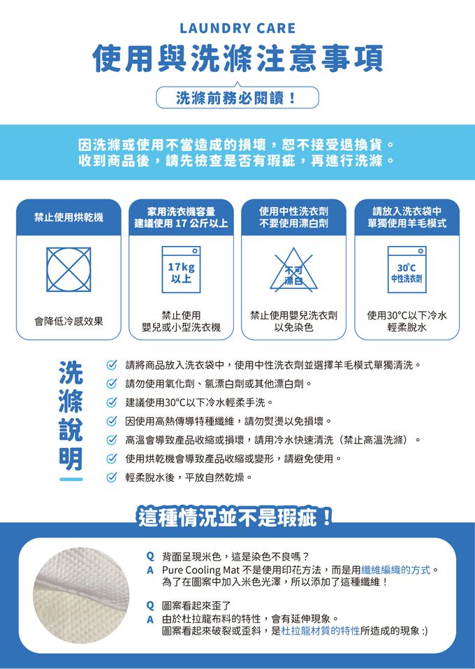 注意事項:●請將商品放入洗衣袋中,使用中性洗衣劑並選擇羊毛模式單獨清洗。 ●請勿使用氧化劑、氯漂白劑或其他漂白劑。 ●建議使用30℃以下冷水輕柔手洗。 ●因使用高熱傳導特種纖維,請勿熨燙以免損壞。 ●高溫會導致產品收縮或損壞,請用冷水快速清洗 (禁止高溫洗滌)。 ●使用烘乾機會導致產品收縮或變形,請避免使用。 ●輕柔脫水後,平放自然乾燥。